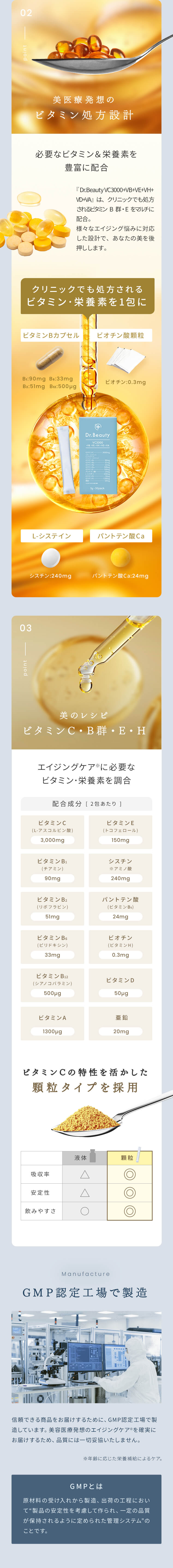 | 特徴 | 01:医療発想のビタミン処方設計 02:独自の高吸収×持続型ビタミンC 03:ビタミン・栄養素の吸収アップ 04:こだわりの剤形 従来のビタミンCサプリメントの課題を解決し、理想の効果を実現する革新的な製品です。 リポソーム化ビタミンC、タイムリリースビタミンCなどを独自の処方設計で配合することで、高い吸収率と吸収持続性を両立しました。 さらに、美容と健康に必要な美容医療機関でも処方されるビタミン・栄養素を配合したマルチビタミンサプリメントです。 |