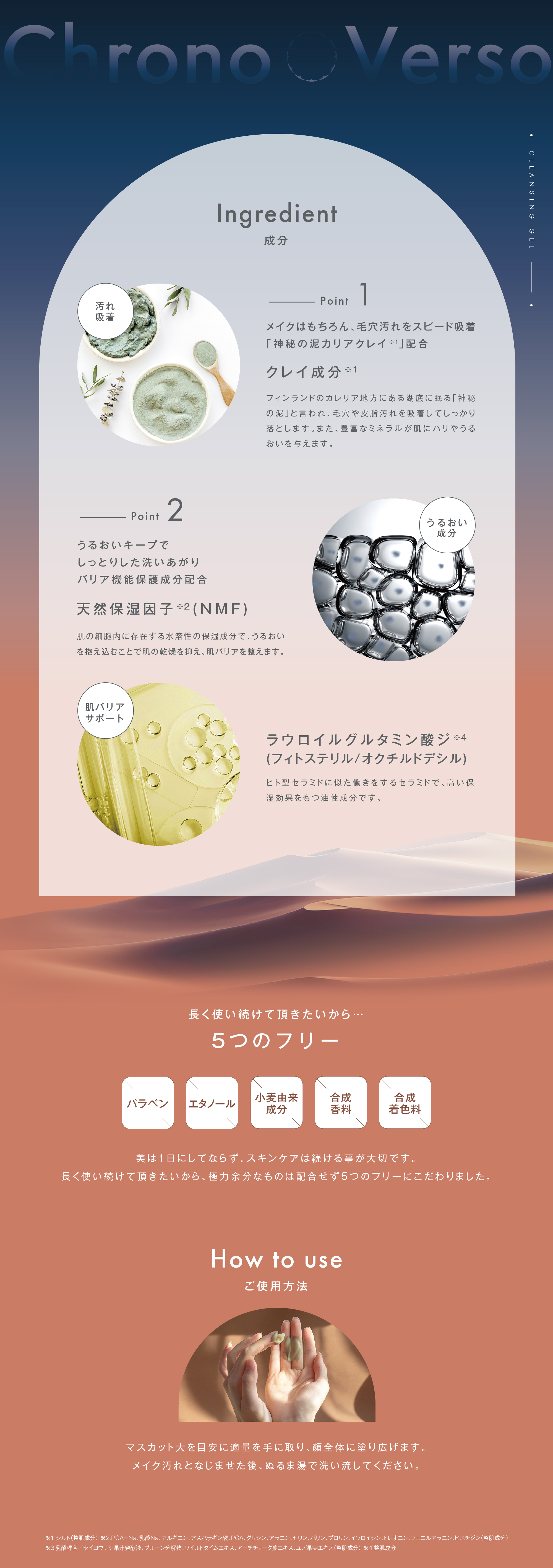 | 成分 | 水、ヤシ油脂肪酸PEG-7グリセリル、DPG、PPG-14ポリグリセリル-2エーテル、1,2-ヘキサンジオール、シルト、カルボマー、フェノキシエタノール、水酸化K、グリチルリチン酸2K、グリセリン、BG、ラウロイルグルタミン酸ジ(フィトステリル/オクチルドデシル)、乳酸桿菌/セイヨウナシ果汁発酵液、PCA-Na、乳酸Na、アルギニン、プルーン分解物、アスパラギン酸、PCA、グリシン、アラニン、セリン、ワイルドタイムエキス、バリン、プロリン、イソロイシン、トレオニン、フェニルアラニン、ヒスチジン、アーチチョーク葉エキス、ユズ果実エキス、トコフェロール |