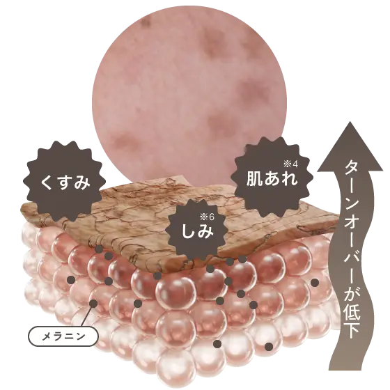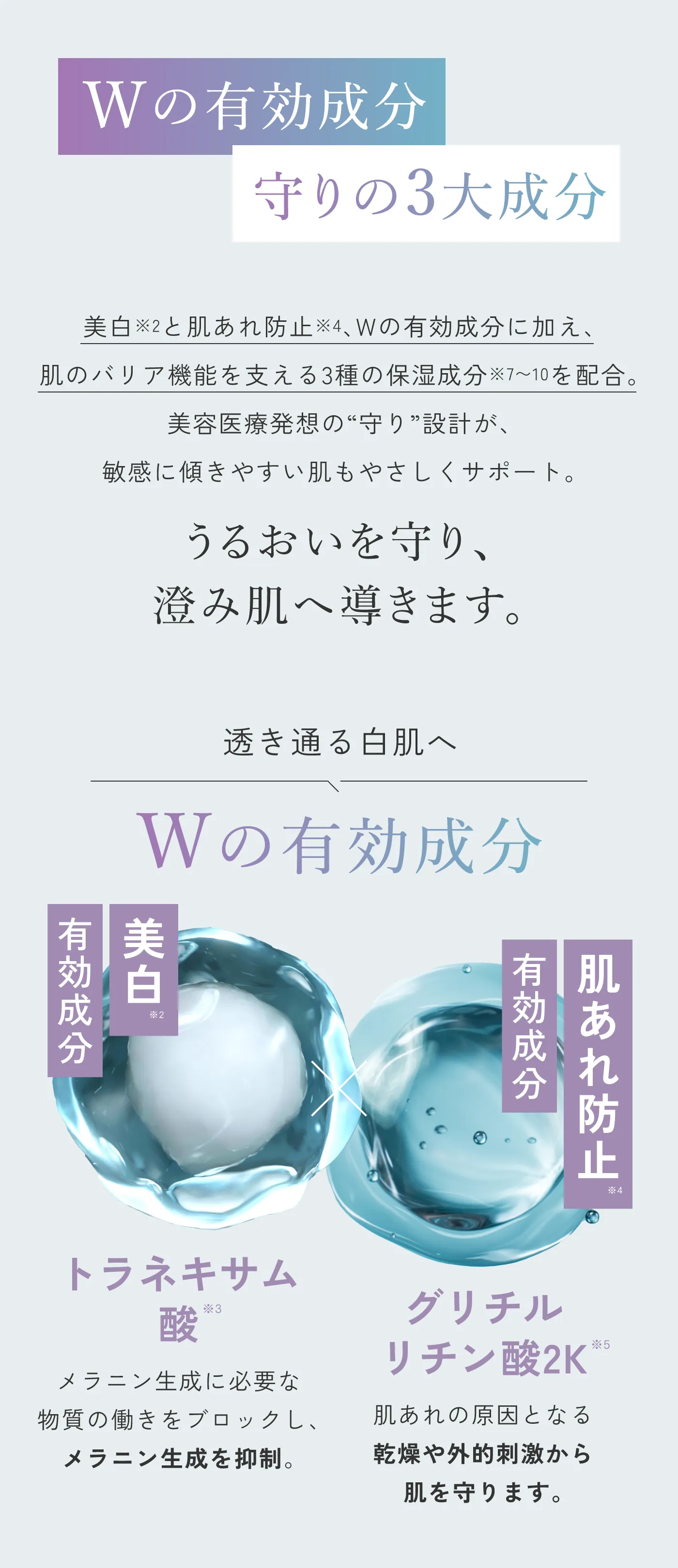 ※3 トラネキサム酸(美白有効成分) ※4 乾燥や外部刺激による肌あれ ※5 グリチルリチン酸2K(肌あれ有効成分) ※6 古い角質や乾燥による