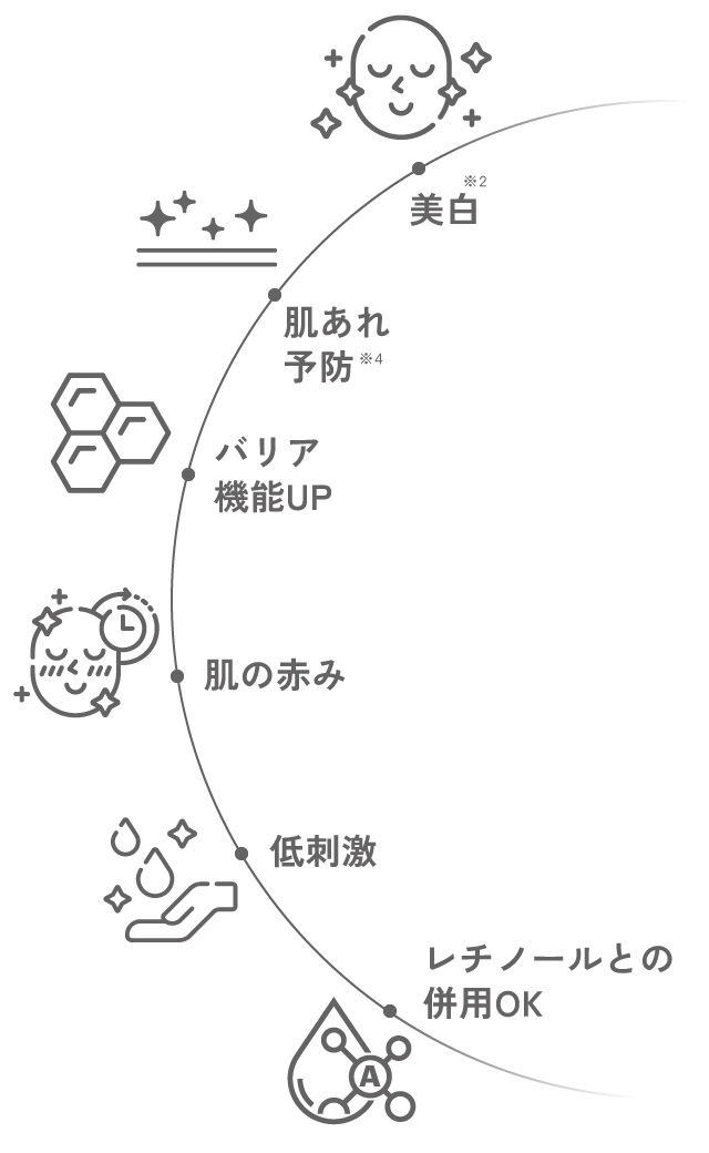 シミ・くすみ※6や肌あれ※4を防ぐ有効成分に加え、肌のバリア機能を支える守りの保湿成分をバランスよく配合。
